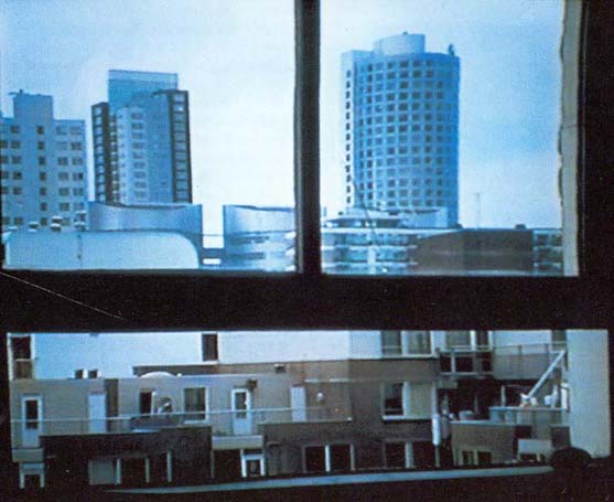 Three monitors and two video projectors: In one video projection a window is portrayed behind which a city facade with no form of movement in it. The other video projection on the opposite wall shows a seaside; the beach, some dune grass that slightly moves due to a breeze, and a calm sea. In between the three monitors are positioned, all showing in different rhythms their image followed by a black screen. The first depicts the sky and a flying bird. The second monitor pictures an on the glass painted bird and behind it some gently waving grass. The third monitor portrays a modern glass building that reflects the sky and the clouds that pass by. There is no human being in sight, yet the sounds added to the installation are those of full-scaled, non-stop city action.