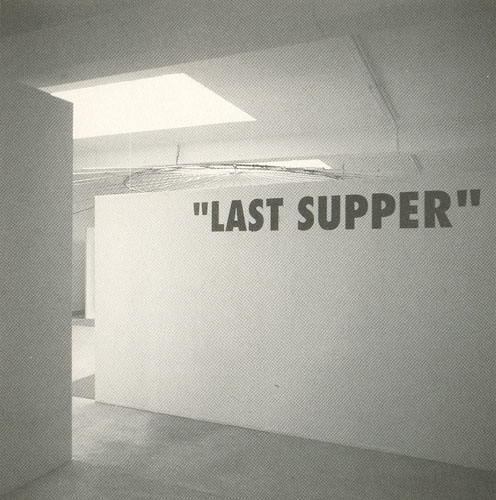 A 100 m2 (1100 sq. ft) square space, surrounded by walls; each wall has a door in the middle; red carpets are connecting the four doors, thereby forming a red cross in the middle of the floor surface; above this space an all-covering umbrella-like bamboo roof, the form of which is reminiscent of a half globe; three tables and twelve chairs are located in the middle near the crossing carpets; in a surrounding circle twelve paintings (silkscreen on sand on canvas, each 200 x 170 cm/ 79”x 67”) are freely hanging from the ceiling; the paintings depict the destruction of the human environment by mankind´s “progress”, including tanks, fighter planes, gas masks, soldiers and military cemeteries. Visitors of the installation were served red wine and bread.
