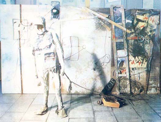 The background wall of this installation is composed of three parts that represent the history of the Soviet Union (Revolution time, Repression and Cold War); the wall shows severe signs of destruction. In front of this wall stands a sculpture of a man, without a face. This sculpture -visibly made out of newspapers- is hollow on the inside. The sculpture is connected with a rope and chain to the wall and surrounded by some broken objects.
