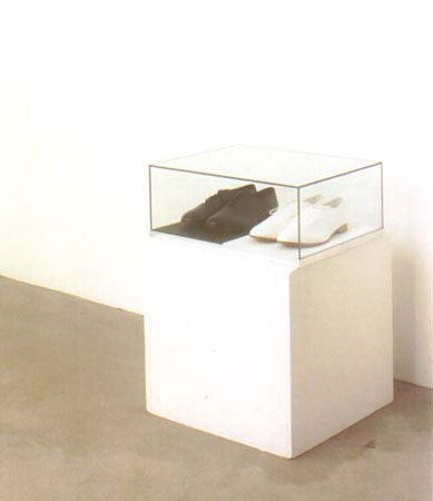 Two pairs of tap dance shoes -one in white, the other in black- are placed under a glass cube on a black and white wooden base. The object is accompanied by the sounds from an original song and tap dance performance of the legendary Al Jolson, a white tap dancer who used to colour his face black for his performances.
