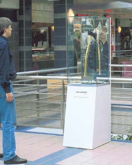 This object consists of a glass cube, standing on a socle. The background and base planes are constituted by mirrors. The background mirror is severely cracked by a large axe that sticks into it. The handle of the axe is covered with gold leaf. On the base the broken mirror fragments are scattered around. Looking at the object on eye level, one can not see oneself in the cracked background mirror, instead the golden handle is what catches the eye. The issue “to have or to be” is the main theme of this object. The object raises questions to the observer on the loss of conscience of modern man, the role of money in contemporary, consumptive society and its influence on our morals. The object is on permanent display in a shopping mall in Hurth, Germany.
